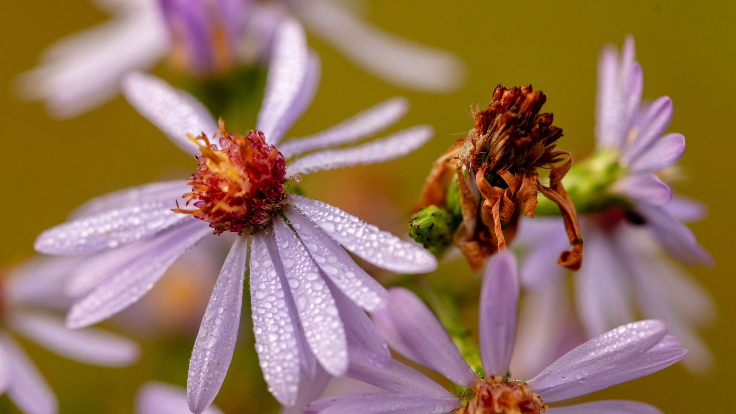 Download 2560x1440 tripolium, flower, petals, drops, macro, blur wallpaper, background widescreen 16:9