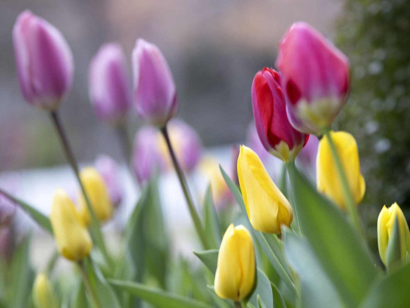 Download 1400x1050 tulips, buds, leaves, flowers, blur wallpaper, background standard 4:3