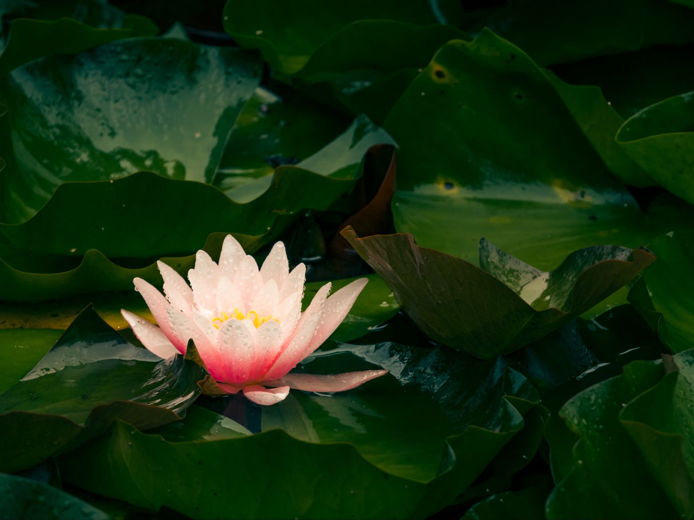 Download 1400x1050 water lily, flower, petals, leaves, pink, drops wallpaper, background standard 4:3