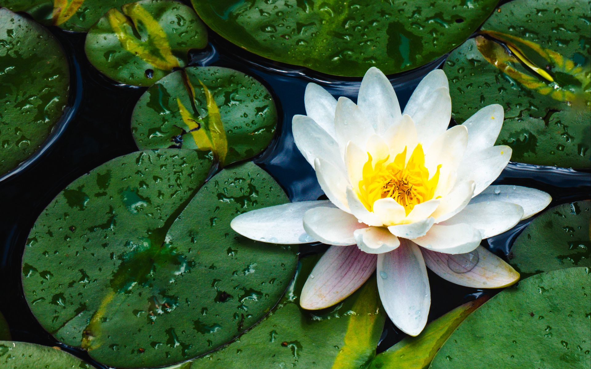 Download 1920x1200 water lily, flower, petals, leaves, drops, water wallpaper, background widescreen 16:10