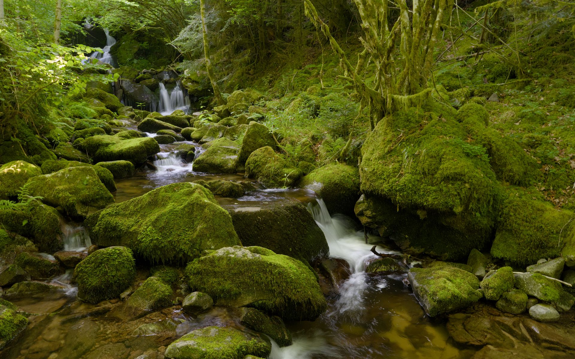 Download 1920x1200 water, river, waterfall, stones, moss, greenery, nature wallpaper, background widescreen 16:10