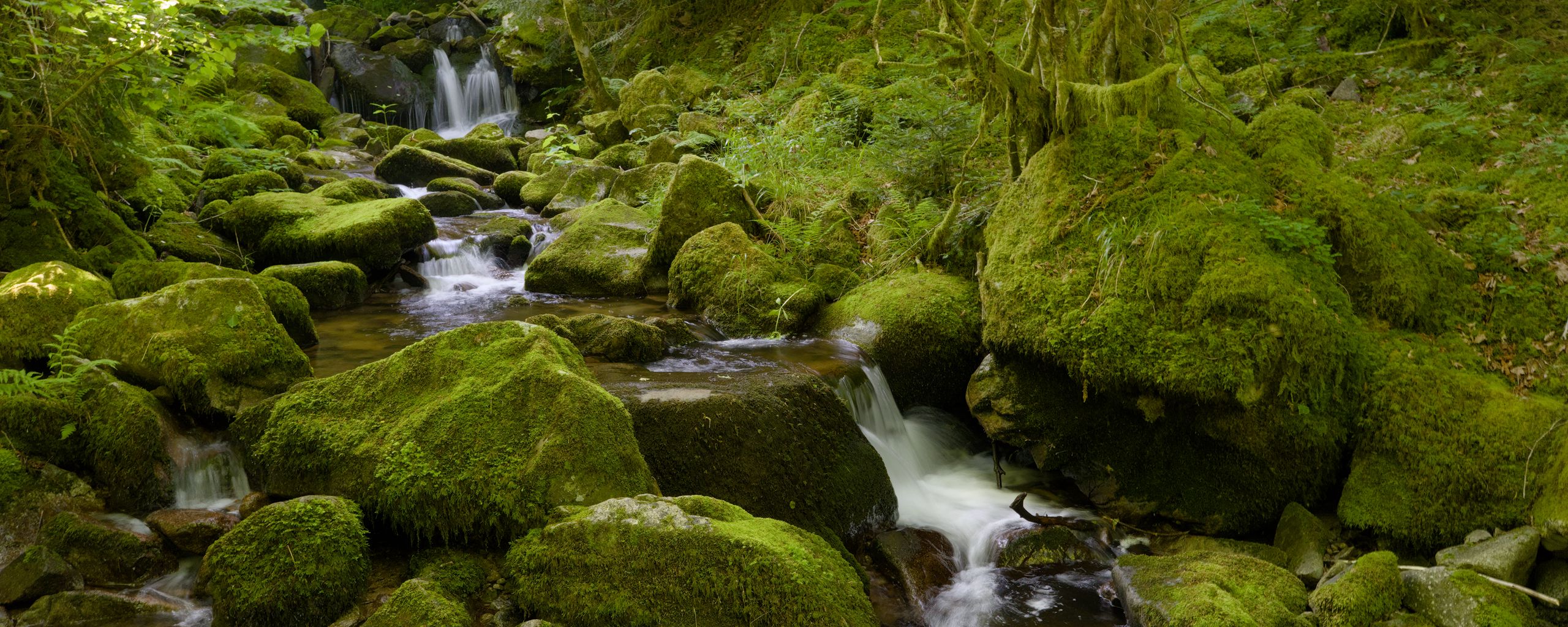Download 2560x1024 water, river, waterfall, stones, moss, greenery, nature wallpaper, background ultrawide monitor