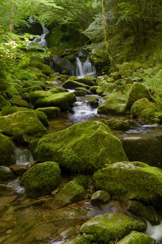 Download 320x480 water, river, waterfall, stones, moss, greenery, nature wallpaper, background samsung galaxy ace gt-s5830, sony xperia e, miro, htc wildfire s, c, lg optimus