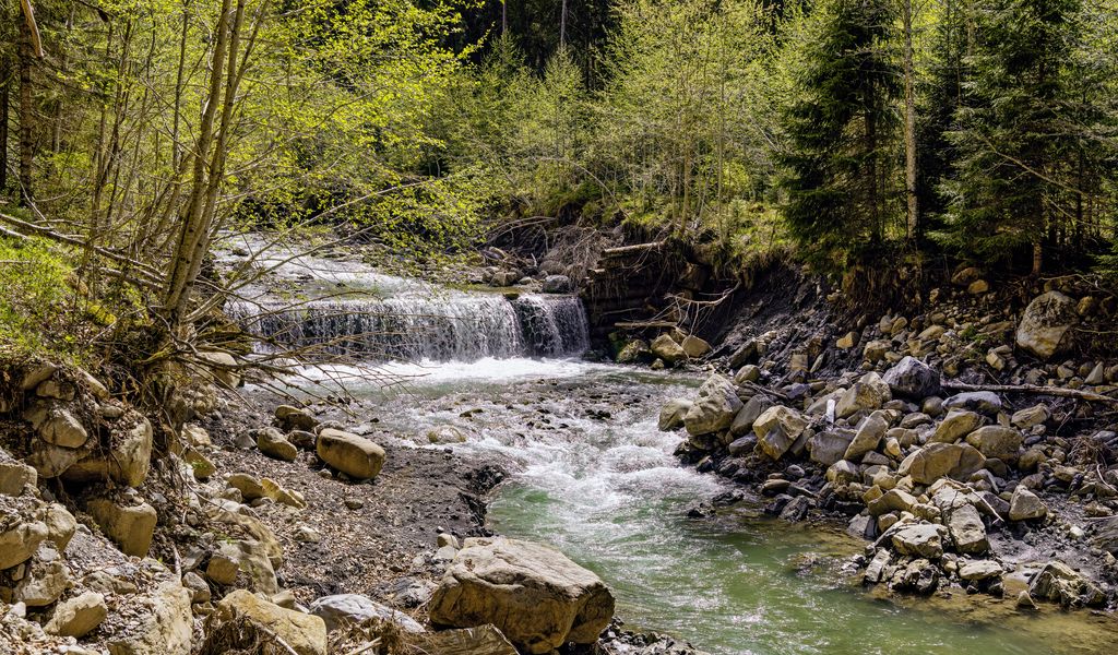 Download 1024x600 waterfall, river, trees, rocks, forest, nature wallpaper, background netbook, tablet