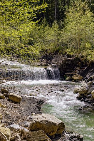 Download 320x480 waterfall, river, trees, rocks, forest, nature wallpaper, background samsung galaxy ace gt-s5830, sony xperia e, miro, htc wildfire s, c, lg optimus