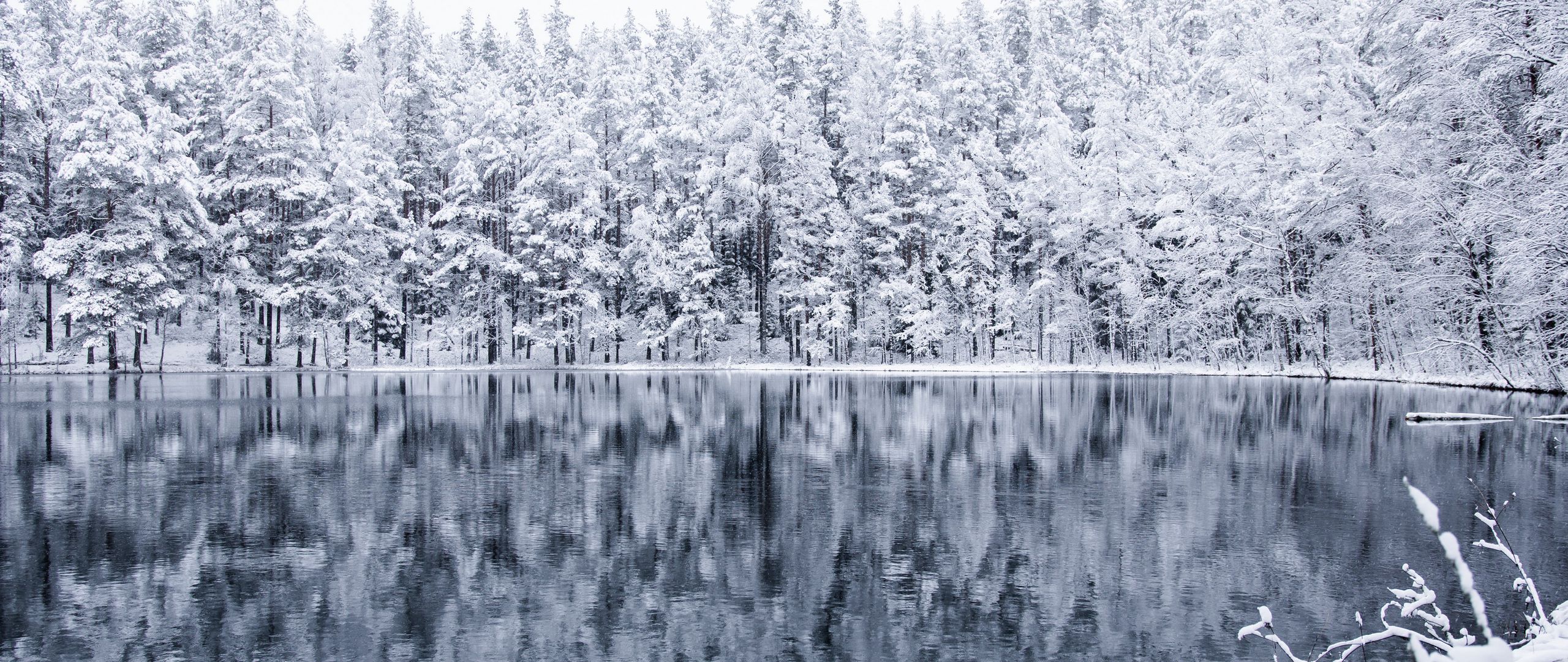 Download 2560x1080 winter, forest, lake, snow, reflection wallpaper, background dual wide 1080p